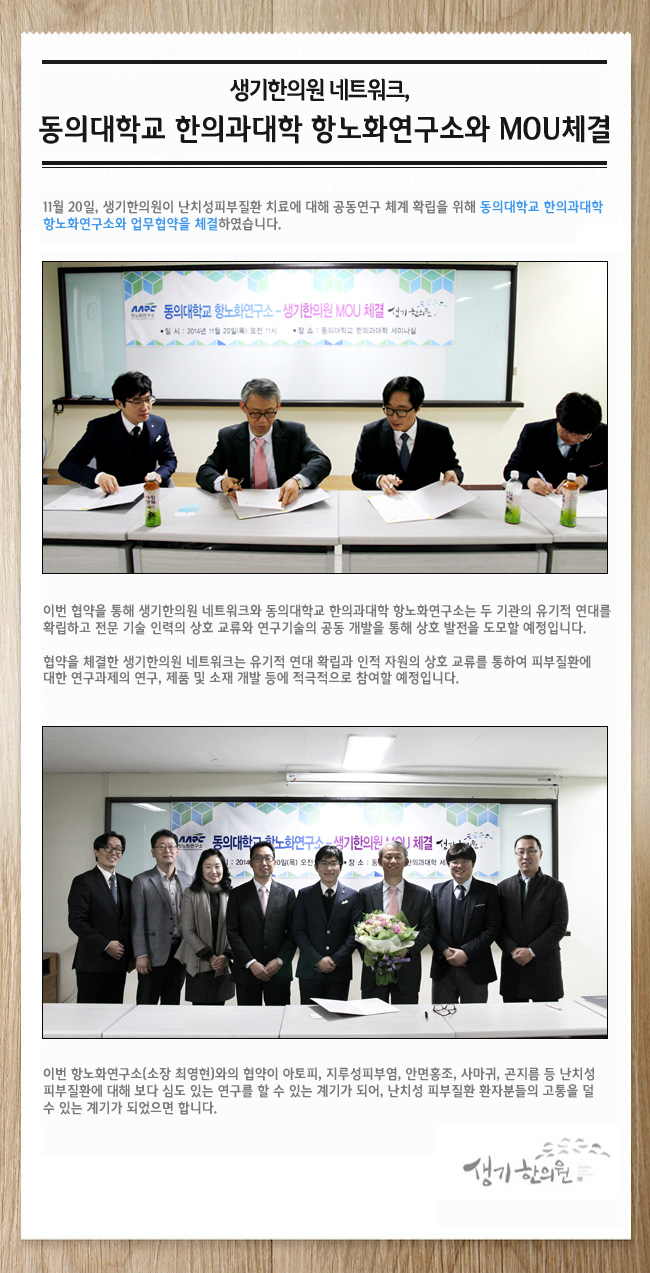 생기한의원 네트워크, 동의대학교 한의과대학 항노화연구소와 MOU 체결